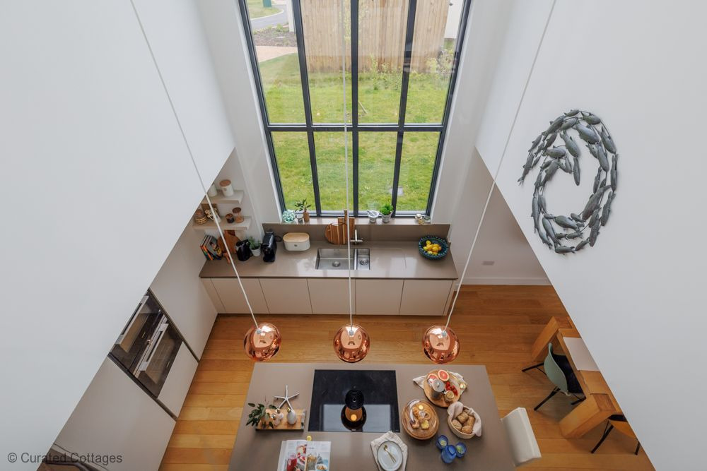 Entering into Serendipity you are immediately met with welcoming light from the huge double height kitchen window and the expansive patio doors by the living area. The kitchen with its island area and four bar stools has all mod cons including a Nespresso coffee machine and Siemens appliances including a full height fridge, separate freezer dishwasher, oven, combi oven and microwave. The dining area beyond the kitchen seats up to 8 guests, and together with the living area offers stunning views over the deck and garden to the lake beyond. The living area has luxury lounge seating suitable for 8 guests, a smart TV and a log burner to enjoy on cooler evenings.