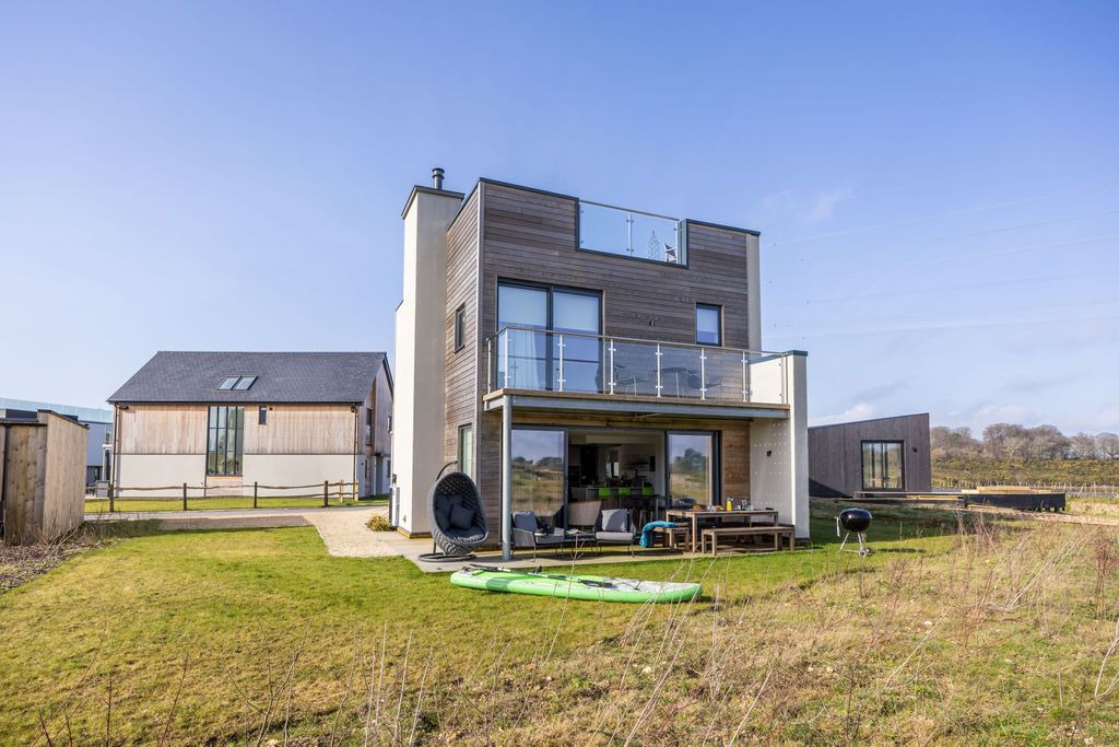 The property has been designed with comfort and relaxation in mind. The ground floor accommodation comprises a light-filled spacious open-plan living, dining and kitchen area, with views over the outdoor deck to the water through floor to ceiling patio doors. The dining section includes a table that seats up to eight and there is a breakfast bar area with seating for three.
